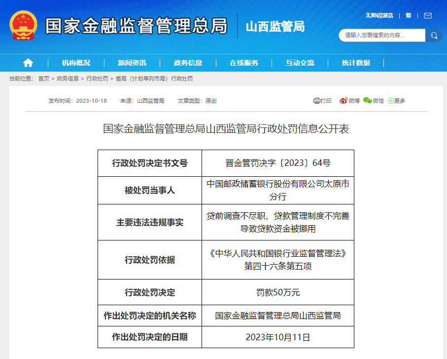 10月18日,国家金融监督管理总局山西监管局行政处罚信息公开表显示,邮政储蓄银行股份有限公司太原市分行,因贷前调查不尽职、贷款管理制度不完善导致贷款资金被挪用,被处以罚款50万元。