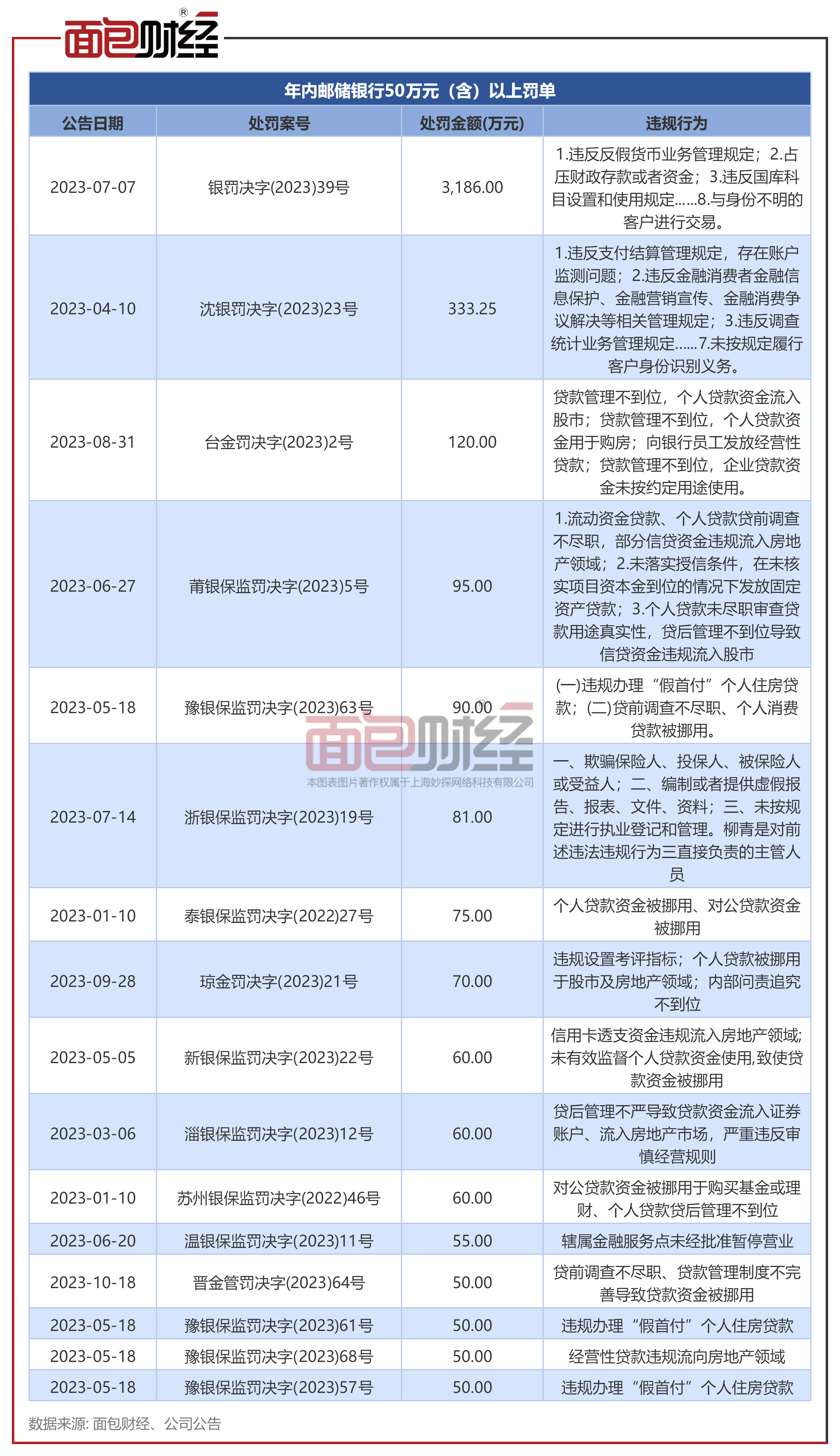面包财经研究员梳理公开信息发现,据不完全统计,2023年以来,邮储银行及其分支机构多次被监管部门处罚。