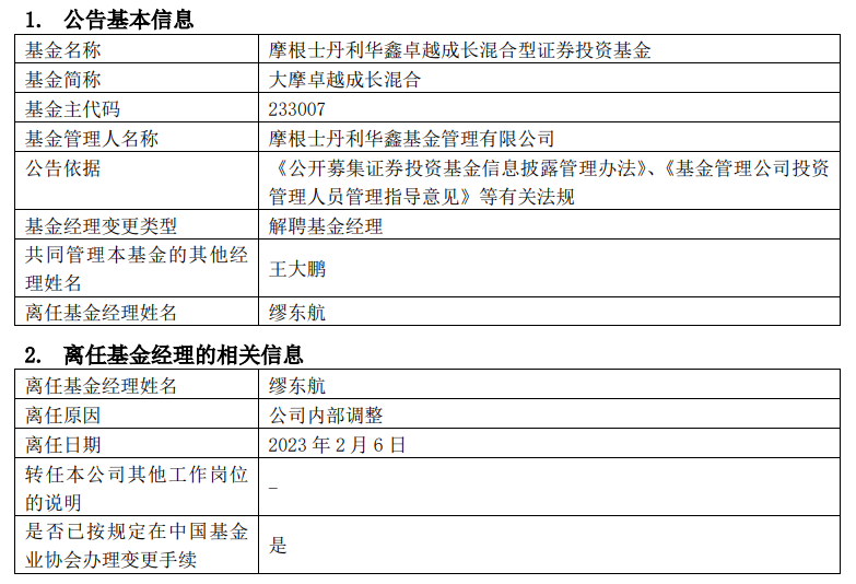 摩根士丹利华鑫卓越成长混合发布基金经理变更公告,自2月6日起,因公司内部调整,该基金解聘基金经理缪东航,由王大鹏单独管理。