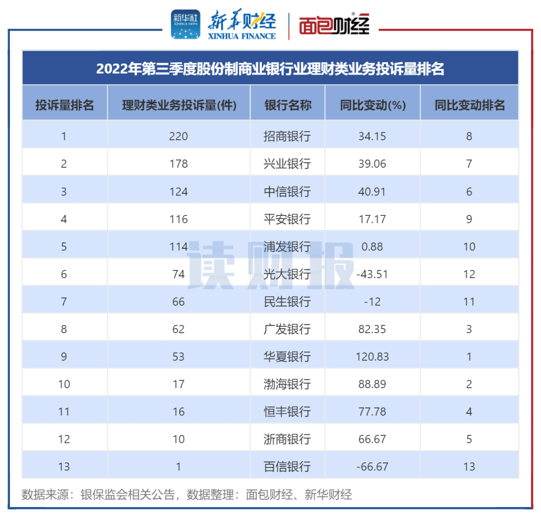 股份制银行理财投诉排名:招行、兴业、中信位居前三