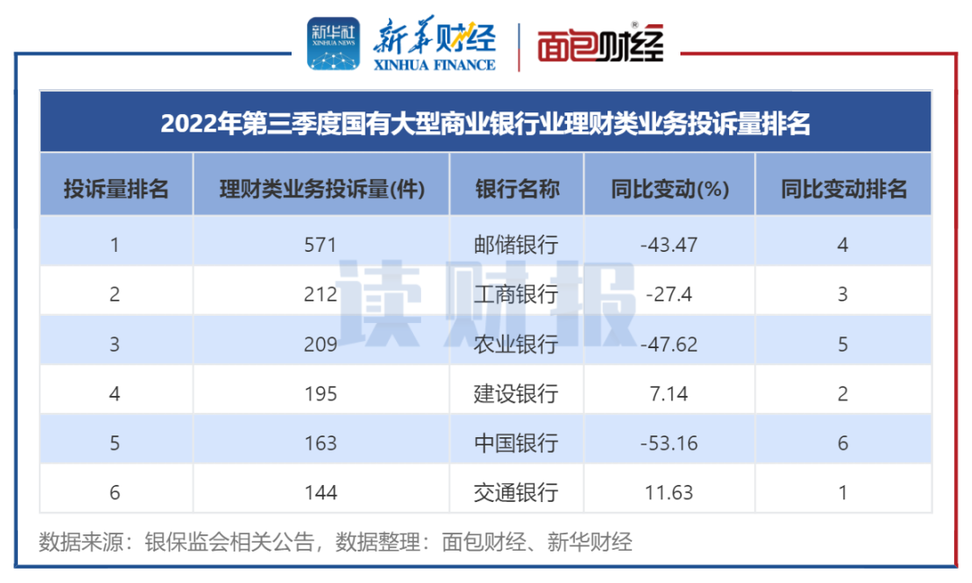 国有银行理财投诉量排名:邮储总量最大,交行同比增速快