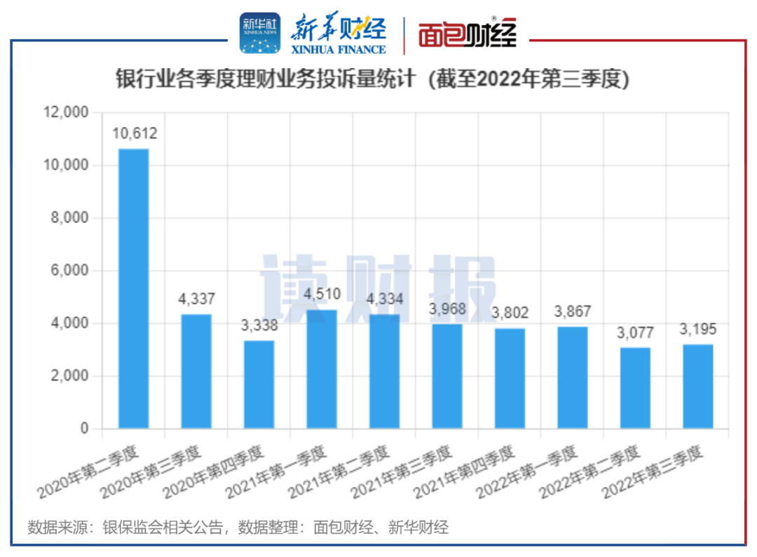 统计数据显示,2022年三季度,银保监会处理银行业理财类消费投诉3195件,与2021年三季度相比,理财业务投诉量下降773件,降幅为19.48%;环比2022年第二季度来看,理财业务投诉量微增3.83% 。