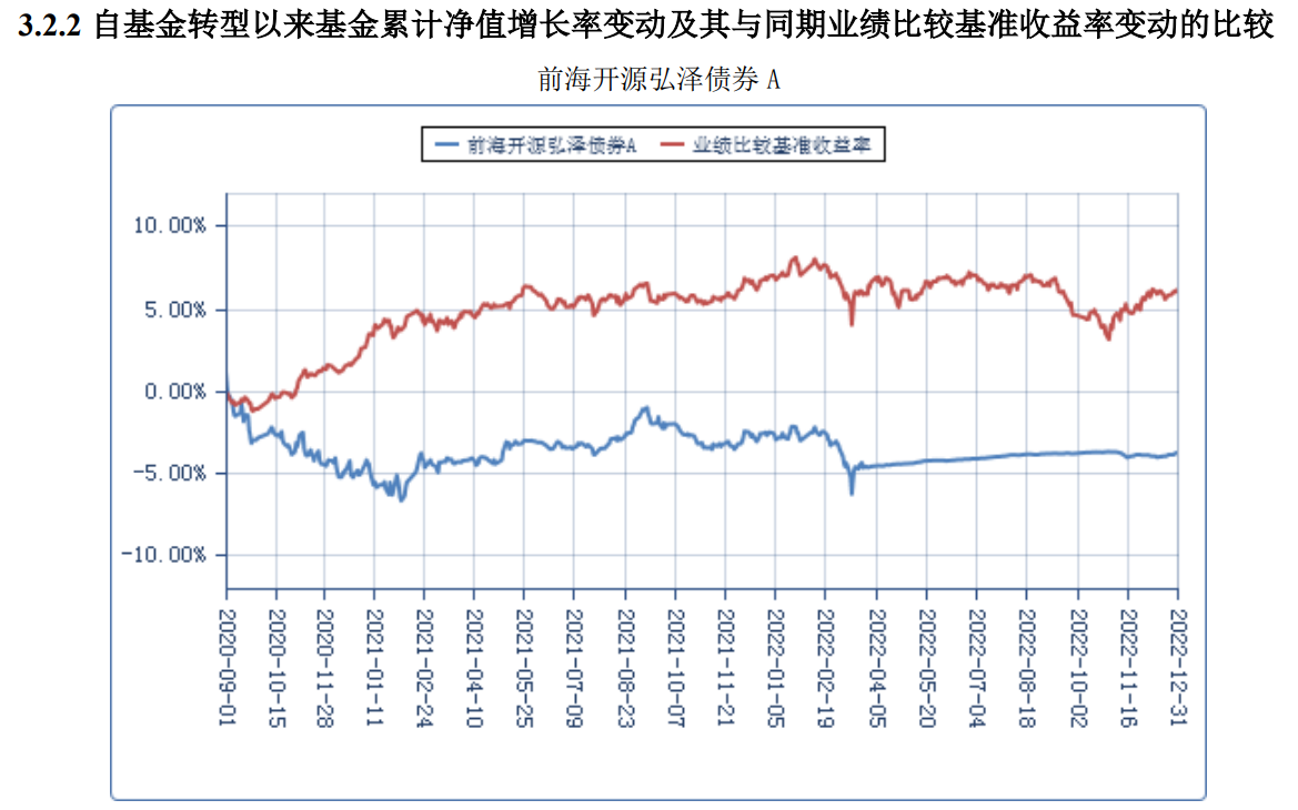 然而,转型以来,前海开源弘泽债券大幅跑输业绩比较基准。截至2022年四季度末,该基金A份额已累计跑输业绩比较基准达9.9个百分点。