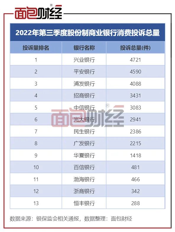 通报数据显示,2022年三季度,兴业银行、平安银行、浦发银行、招商银行和中信银行的总投诉量居前五,投诉总量分别为4721件、4590件、4088件、3431件和3083件。