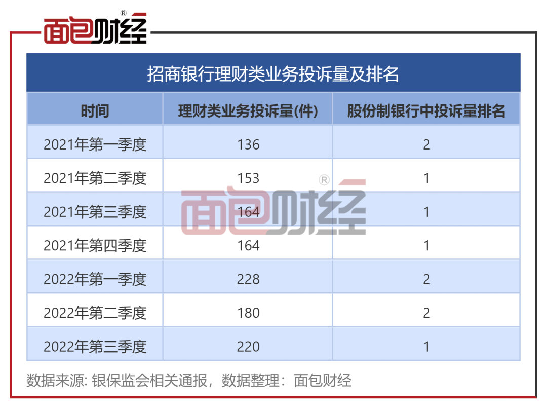 历史数据显示,招商银行的理财业务被投诉量一直处于高位。2021年以来各季度银行业消费投诉情况通报显示,招商银行的理财业务被投诉量一直处于股份制行前两位。
