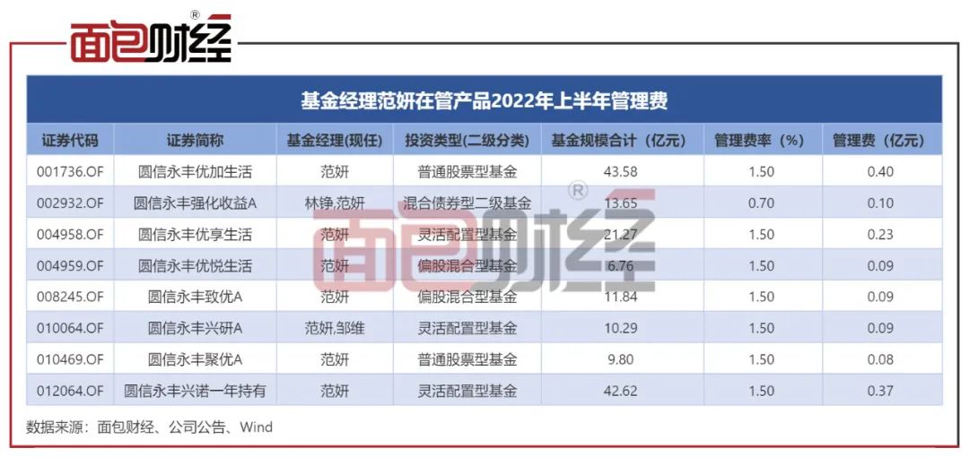 截至2022年末,整个公司主动权益类基金(包括普通股票型、偏股混合型、灵活配置型)规模约170亿元,范妍参与管理的8只产品,除去债券型基金圆信永丰强化收益,其余7只主动权益类产品总规模高达146亿元,占比超过8成。
