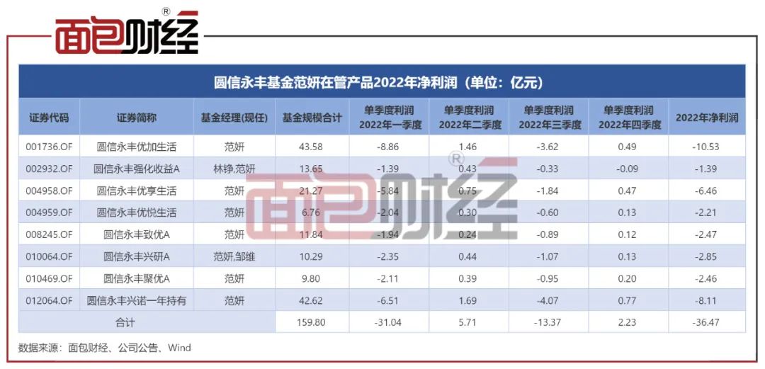2022年,范妍旗下产品收益率全部告负,7只权益类产品均跌超15%,全部产品累计亏损额度达到36亿元,是公司整体规模缩水的重要原因之一。