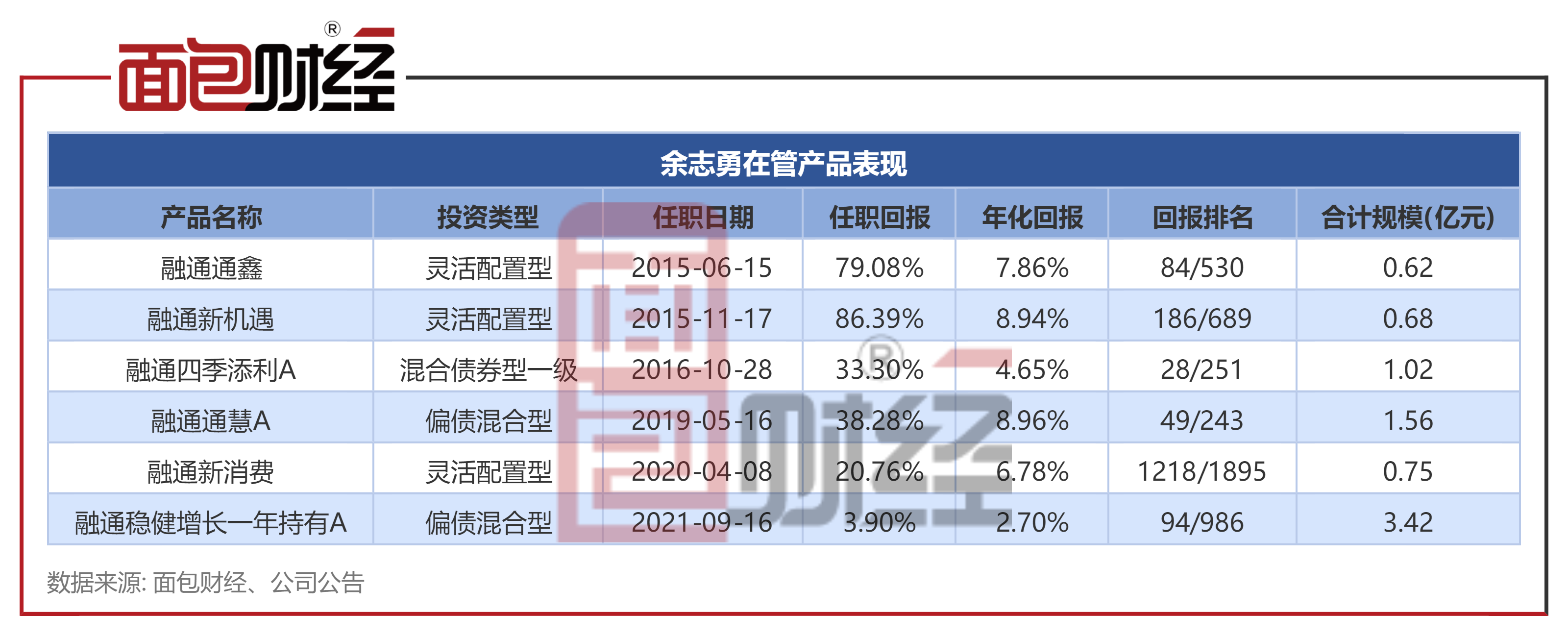 公开资料显示,余志勇于2007年4月加入融通基金管理有限公司,历任研究部行业研究员、行业研究组组长、研究部总监,现任组合投资部总监、融通新机遇灵活配置混合型证券投资基金等基金的基金经理。