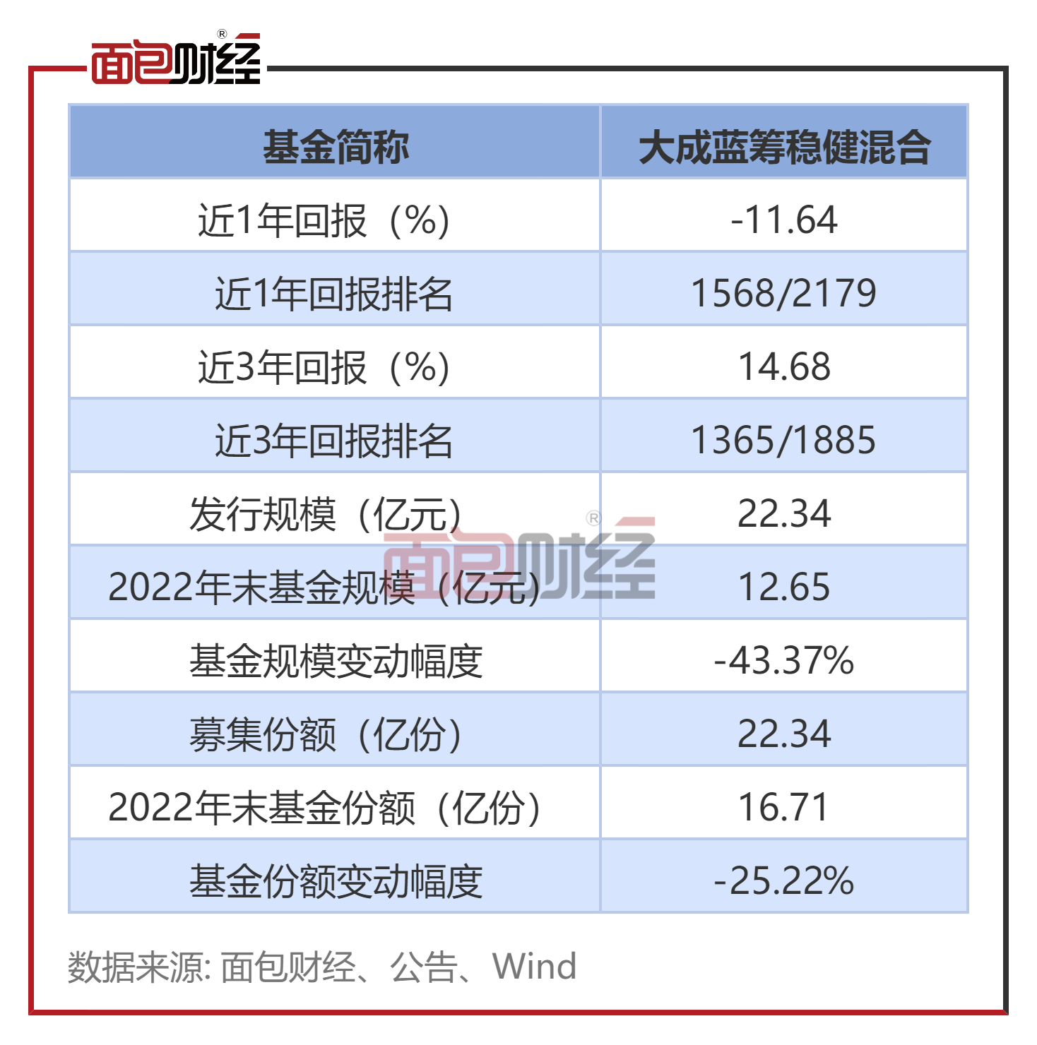 大成蓝筹稳健混合的发行规模约22.34亿元(对应募集份额约22.34亿份)。2022年四季度末,该基金的基金资产净值约为12.65亿元、基金份额总额约为16.71亿份,分别下降约43.37%、25.22%。