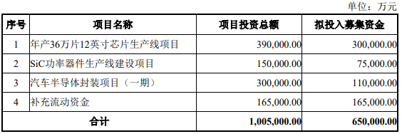 公司定增募集说明书显示,士兰微本次向特定对象发行A股股票募集资金总额不超过65亿元(含本数),扣除发行费用后的募集资金净额拟投资于年产36万片12英寸芯片生产线项目、SiC功率器件生产线建设项目、汽车半导体封装项目(一期),以及补充流动资金。