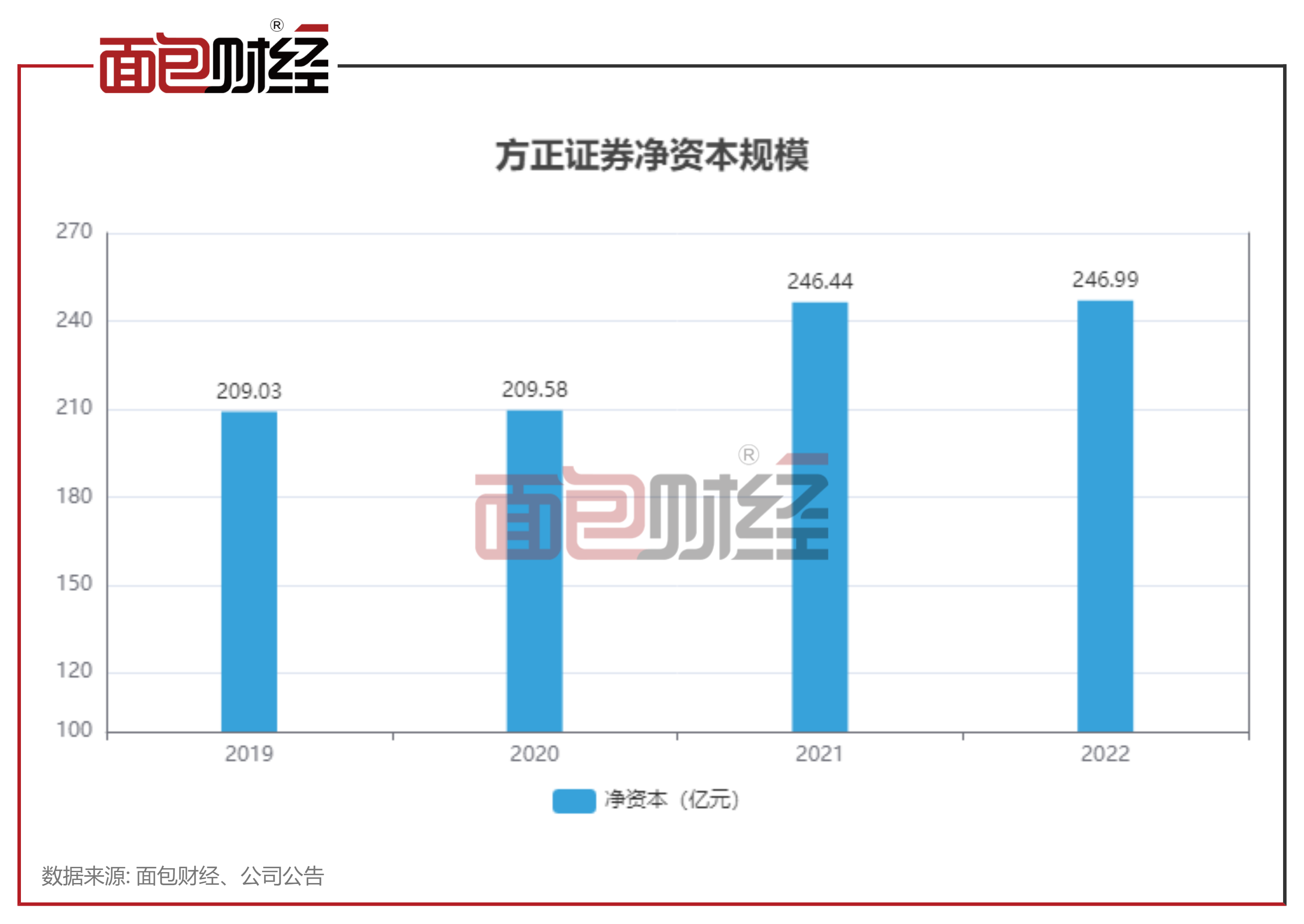 数据显示,截至2022年末,公司净资本规模为246.99亿元,与上年末基本持平,年报显示,近几年公司仅通过净利润留存等补充净资本。