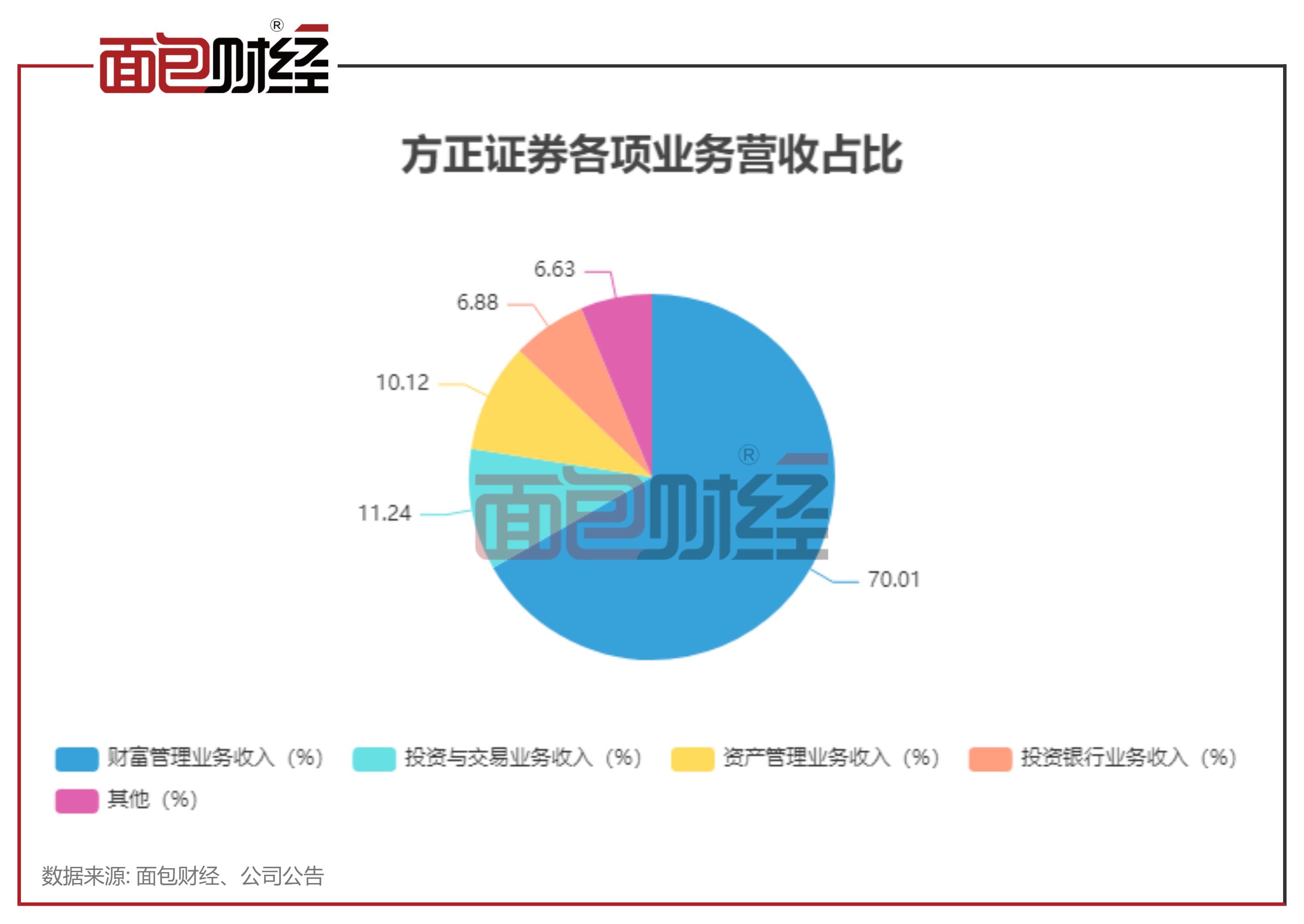 财报显示,方正证券的财富管理业务包括证券经纪业务、信用业务和期货经纪业务等。该业务虽在营收中占比较大,较业务总收入较上年减少14.99%。