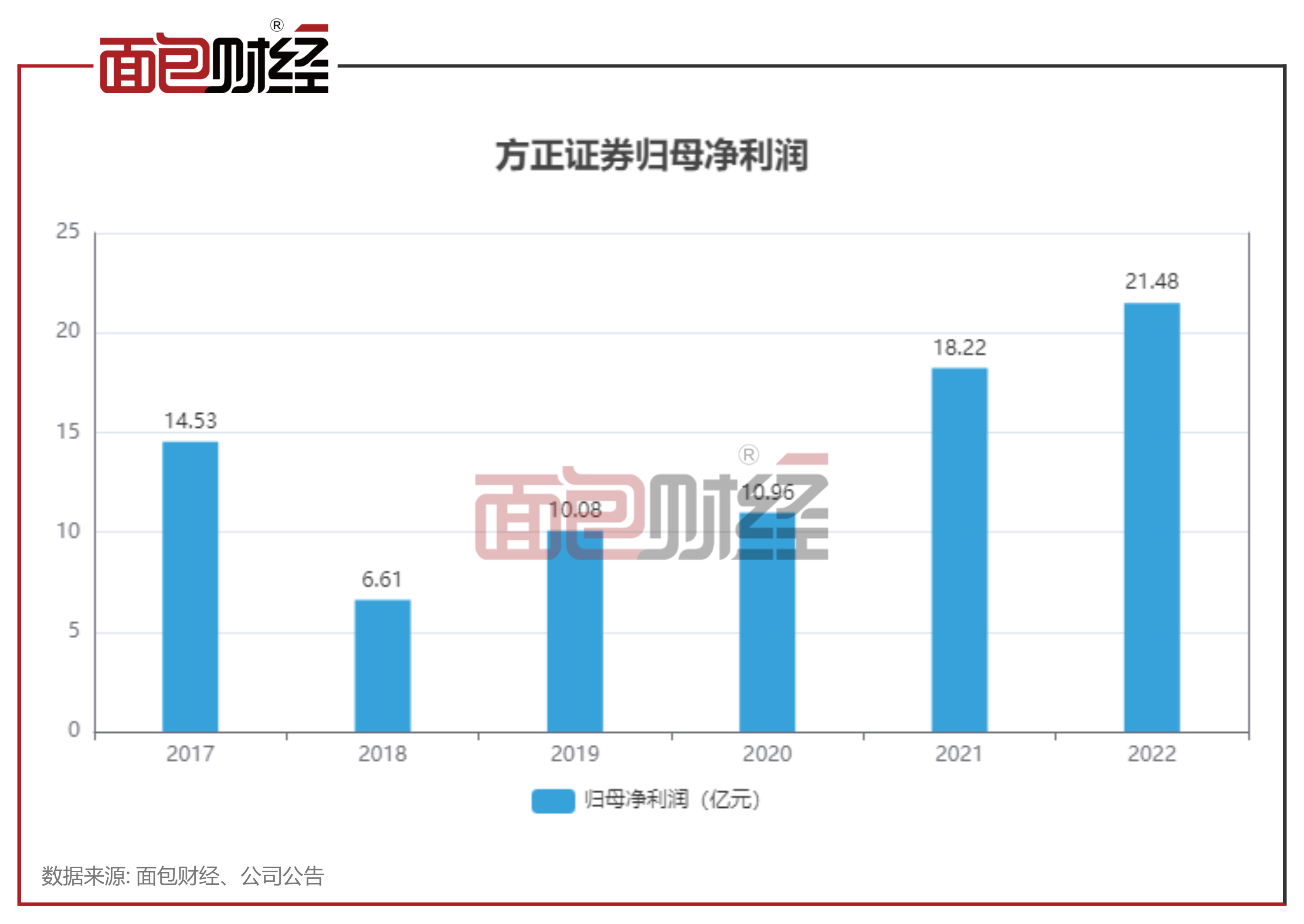 年报显示,2022年末,方正证券实现营业收入77.77亿元,同比减少9.79%;归母净利润为21.48亿元,同比增加17.88%。历史数据显示,截至2022年末,方正证券归母净利润已连续4年增长。