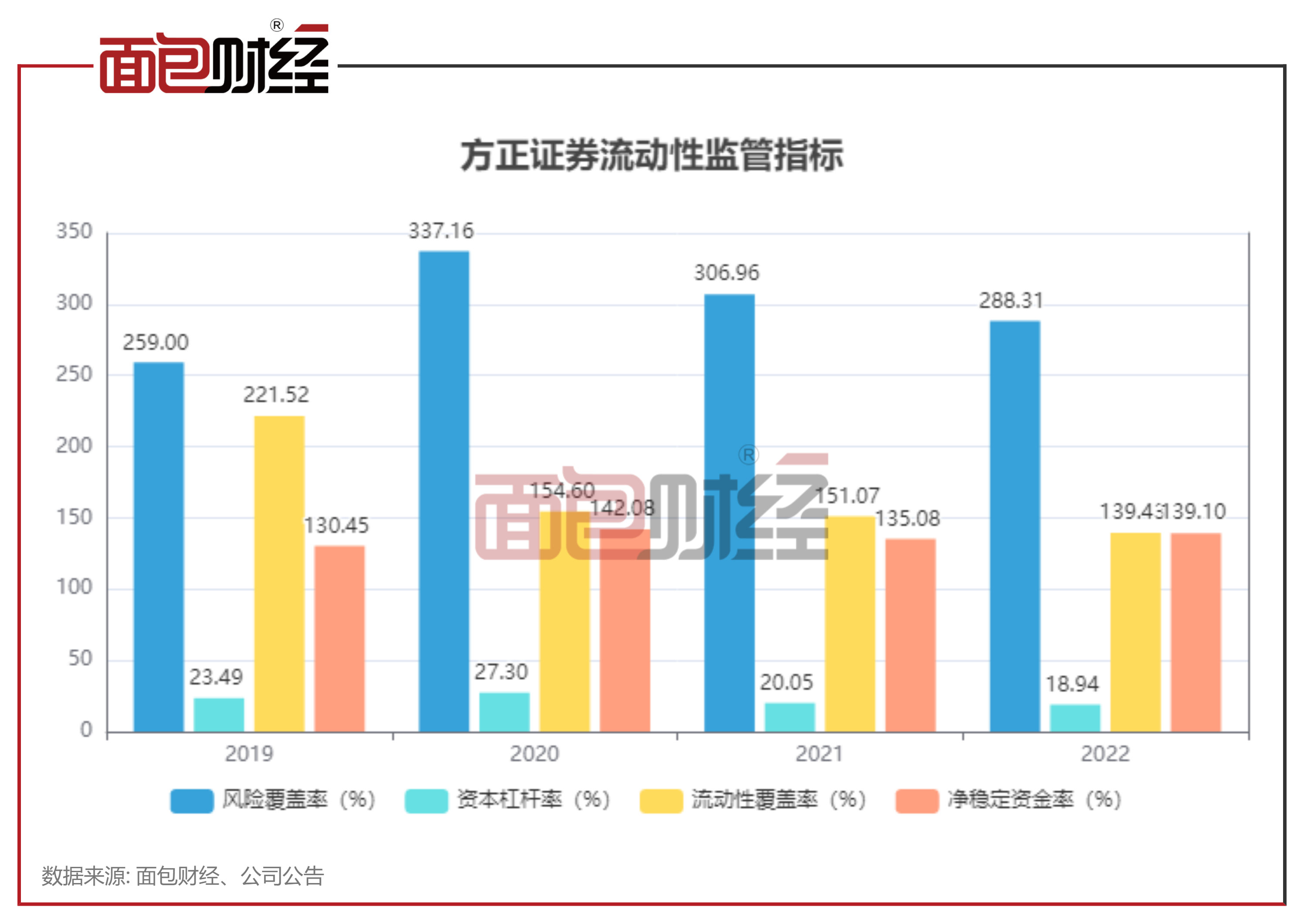 需注意的是,近三年方正证券的流动性覆盖率持续下降,由2019年末的221.52%降至2022年末的139.43%,整体下降了82.09个百分点,已接近120%的预警标准。