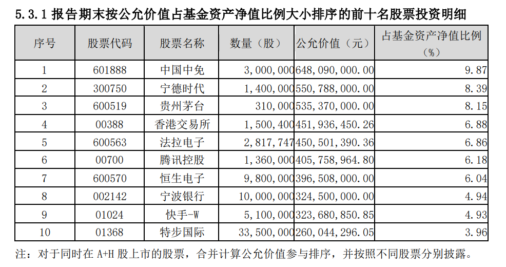 中国中免、宁德时代、贵州茅台为前三大重仓股
