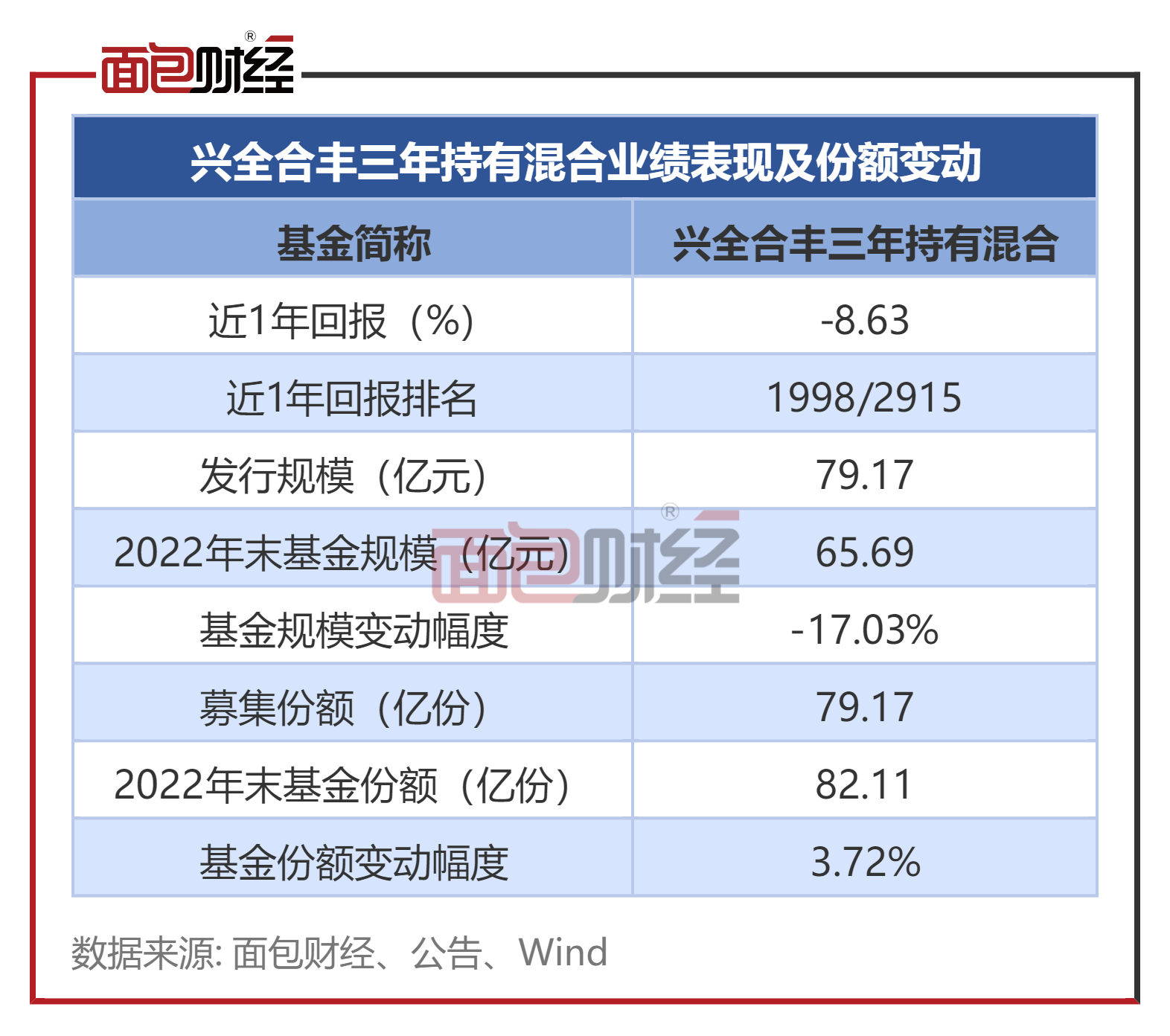 兴全合丰三年持有混合的发行规模约79.17亿元(对应募集份额约79.17亿份)。2022年四季度末,该基金的基金资产净值约为65.69亿元、基金份额总额约为82.11亿份,分别变动-17.03%、3.72%。