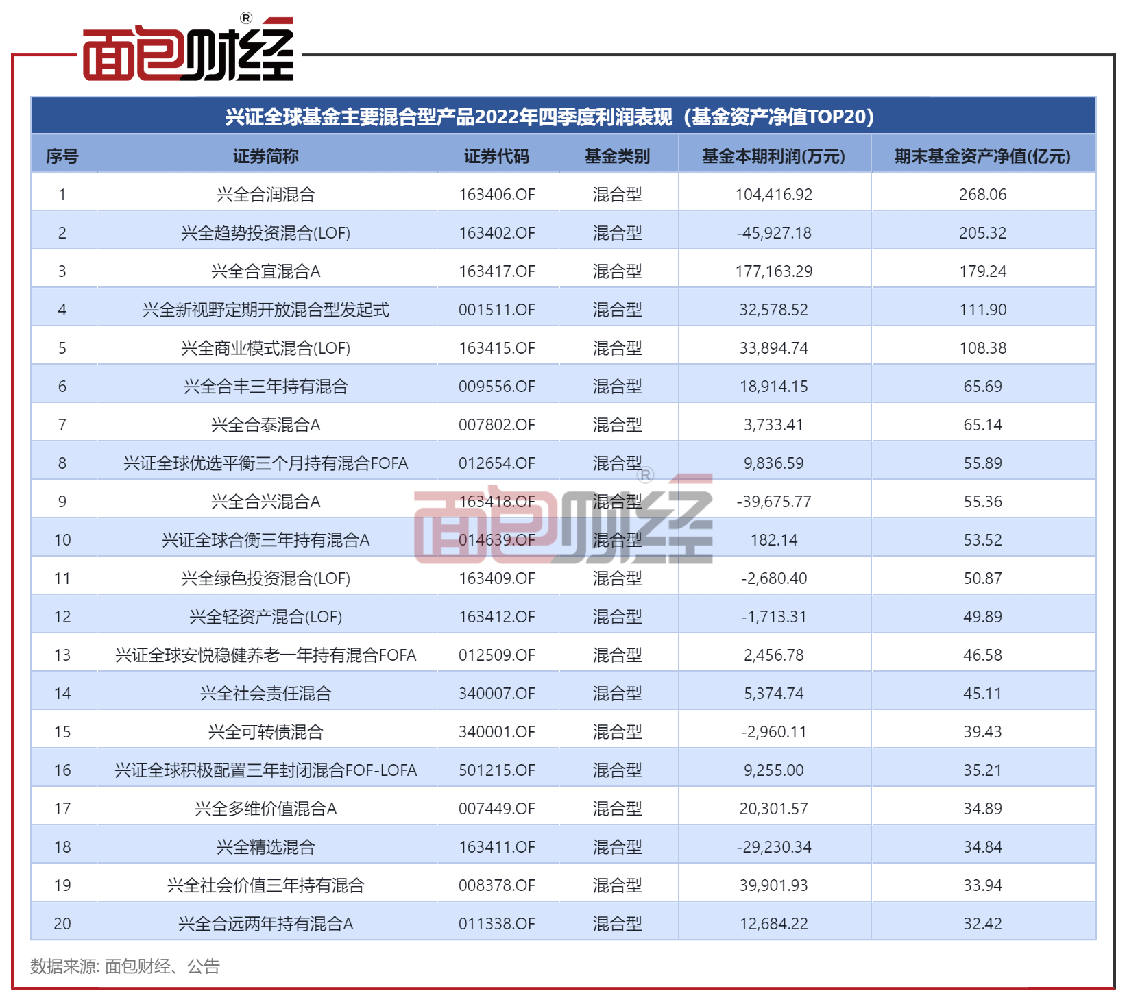 附注:兴证全球基金主要混合型产品2022年四季度利润表现(基金资产净值TOP20)