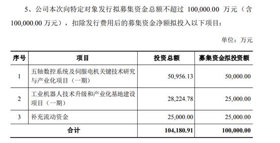 本次定增拟募资不超过10亿。其中,定增募资5亿元将用于五轴数控系统及伺服电机关键技术研究与产业化项目(一期),2.5亿元用于工业机器人技术开发及产业化基地建设项目(一期),2.5亿元用于补充流动资金。