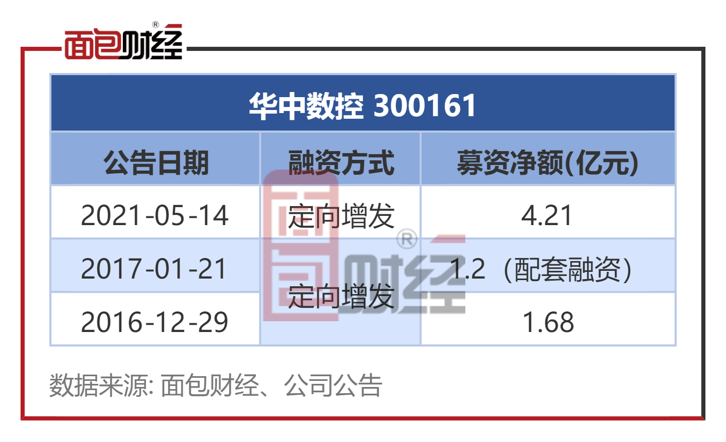 2021年5月,公司通过定增净募资4.21亿元用于高性能数控系统技术升级及扩产项目以及补充流动资金。