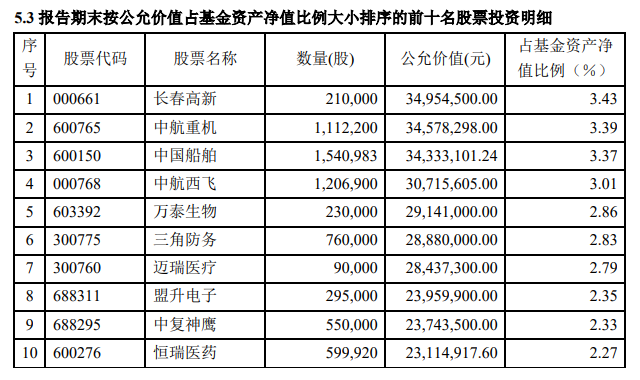 该基金四季度末重仓股包括长春高新、中航重机、中国船舶、中航西飞、万泰生物等企业。