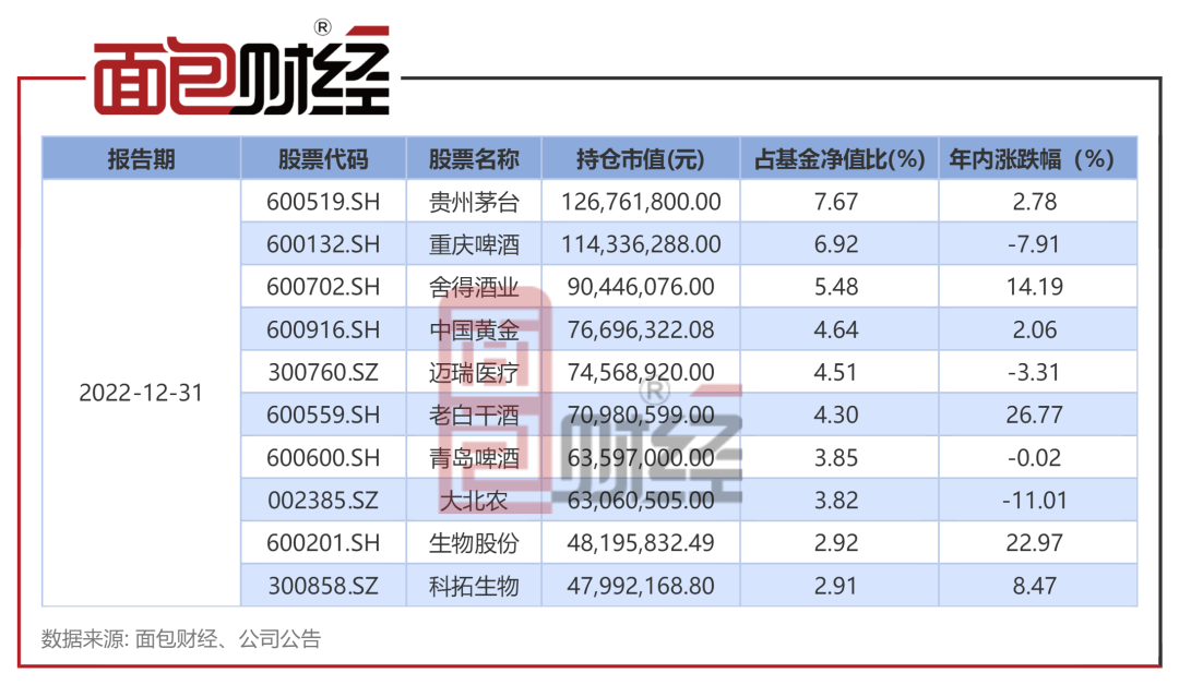 前三大重仓股:贵州茅台、重庆啤酒、舍得酒业
