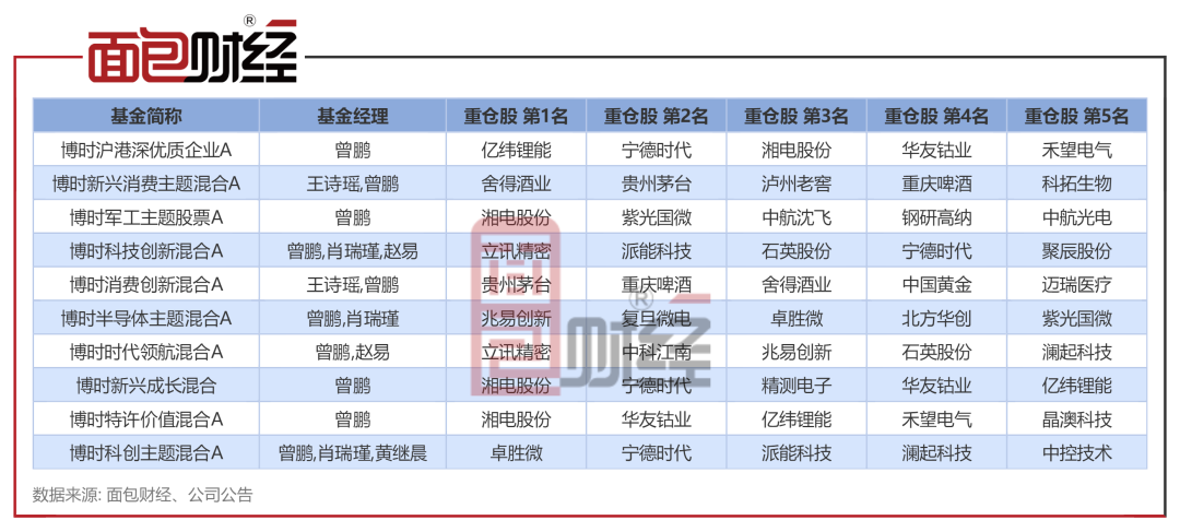 研究发现,曾鹏在管产品持仓存在同质化现象,10只在管基金集中关注科技领域的新能源、生物医疗,消费领域的白酒,2022年4季度报告披露的前五大重仓股重复率较高,主要集中于亿纬锂能、舍得酒业、立讯精密、贵州茅台、湘电股份等标的。