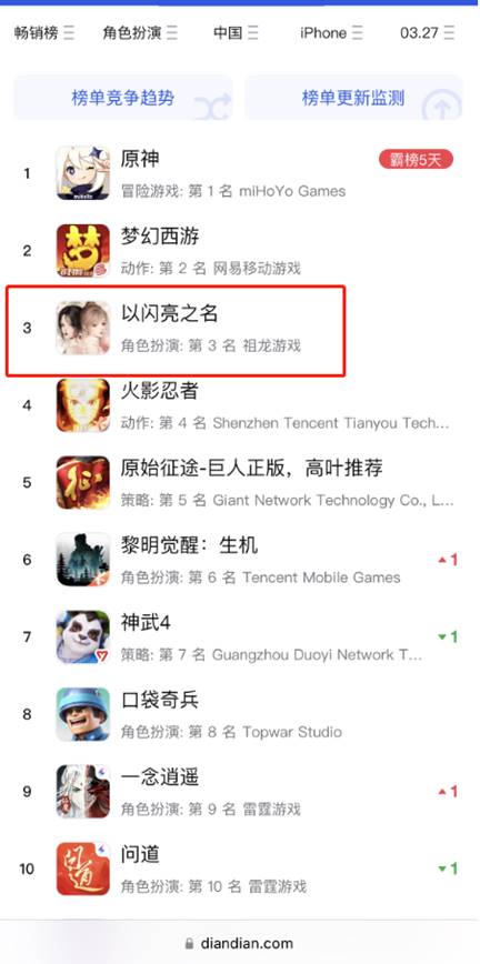 随后2天,《以闪亮之名》依然保持较高热度,点点数据显示,截至3月27日,该游戏仍然位于中国地区app store畅销角色扮演榜第三名。