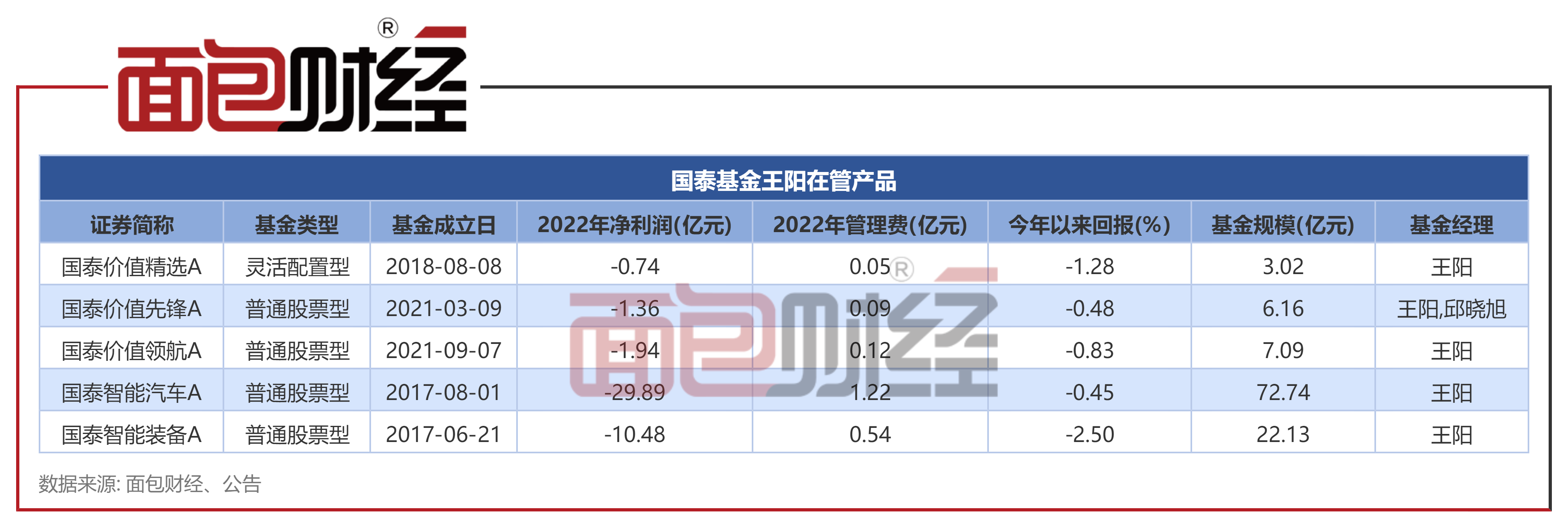 国泰基金近期已陆续完成旗下产品的年报披露。数据显示,王阳在管的5只产品在2022年均出现净浮亏,合计净浮亏超44.41亿元。投资人亏钱,基金公司旱涝保收,国泰基金向上述基金共收取2亿元以上的管理费。