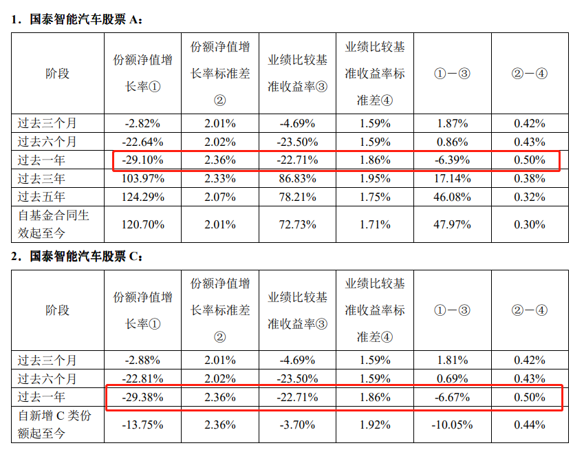 2022年年报显示,国泰智能汽车股票A全年净值下跌29.1%、跑输基准6.39个百分点,C类份额全年净值下跌29.38%、跑输基准6.67个百分点。