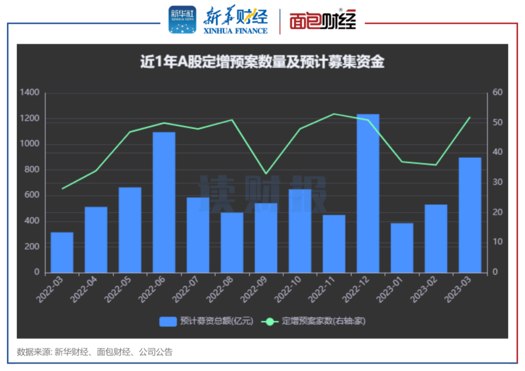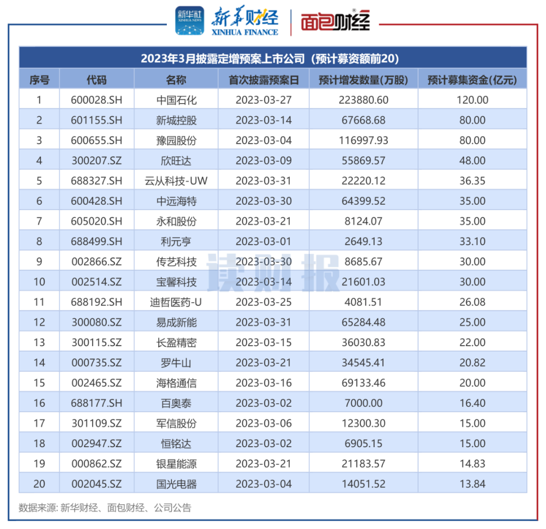 3月共有52家上市公司披露定增预案,预计募资规模合计约896.98亿元,中国石化、新城控股、豫园股份预计募集资金较多。