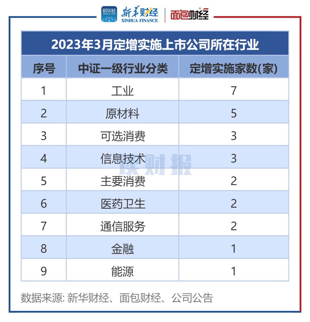 从行业分布来看,以中证行业统计,2023年3月工业行业有7家上市公司实施定增,实施家数排在各行业之首;其次是原材料行业,有5家上市公司实施定增;可选消费、信息技术行业各有3家上市公司实施定增。