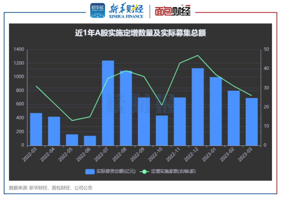 根据信披数据,以定增股份上市日统计,2023年3月A股上市公司实施定增共有26起;实际募集资金合计约693.35亿元,同比减少13.29%。
