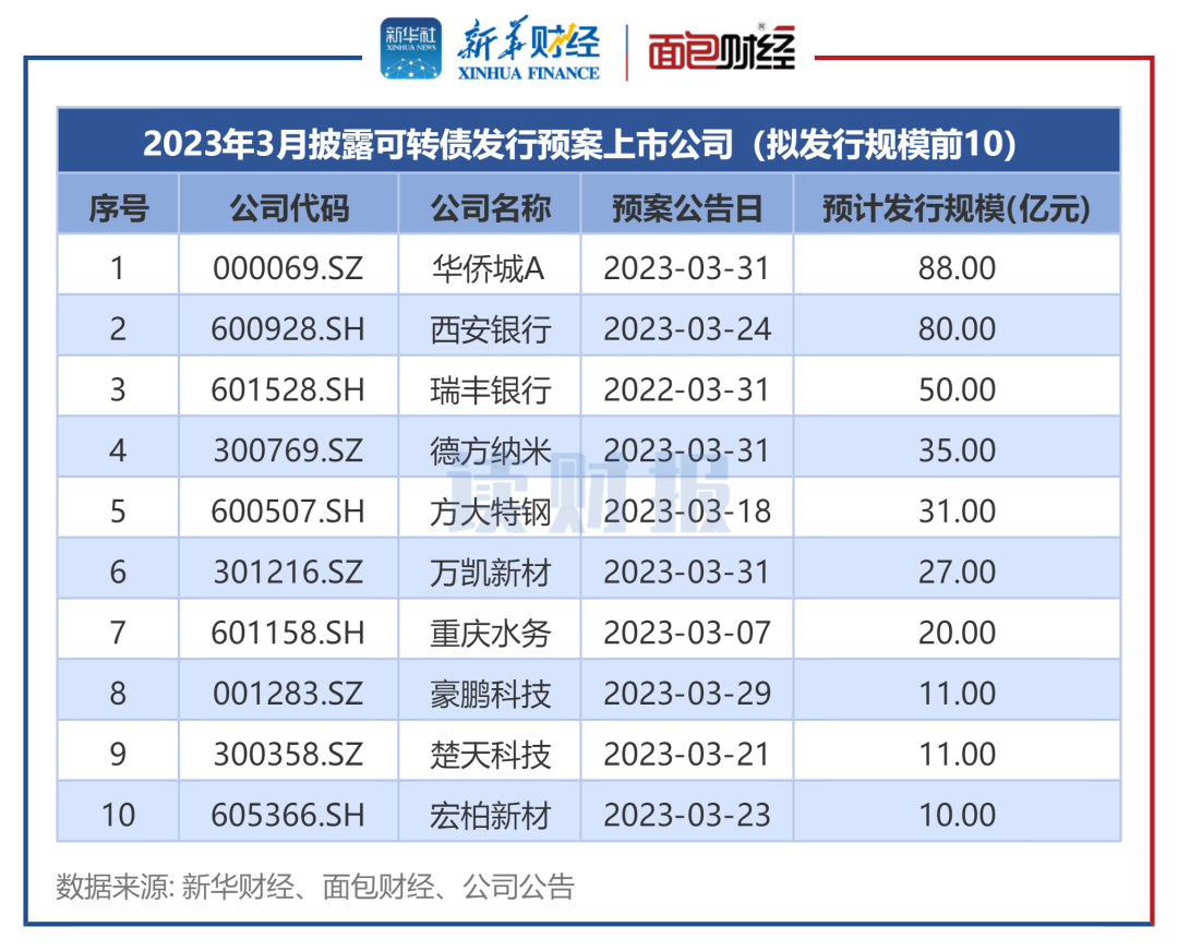 以可转债董事会预案公告日统计,2023年3月共有20家上市公司披露了可转债发行预案,预计发行规模414.85亿元,其中华侨城A、西安银行、瑞丰银行等拟发行规模较多。