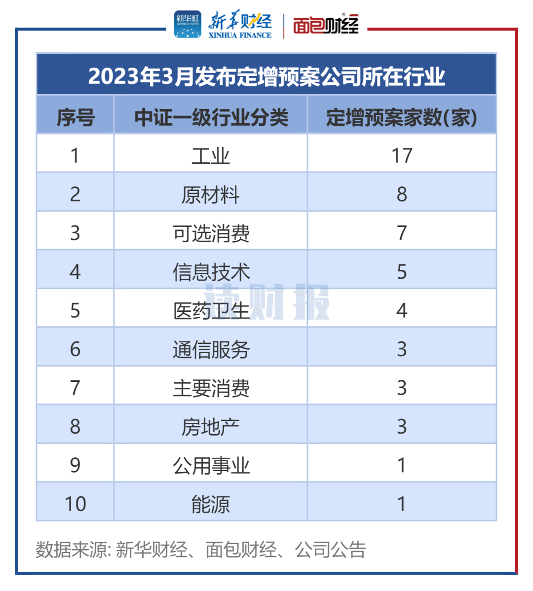 从行业分布来看,以中证行业统计,2023年3月工业行业有17家公司发布定增预案,数量排在各行业之首;原材料行业排在第二位,有8家公司发布定增预案;可选消费行业有7家发布定增预案,位列第三。
