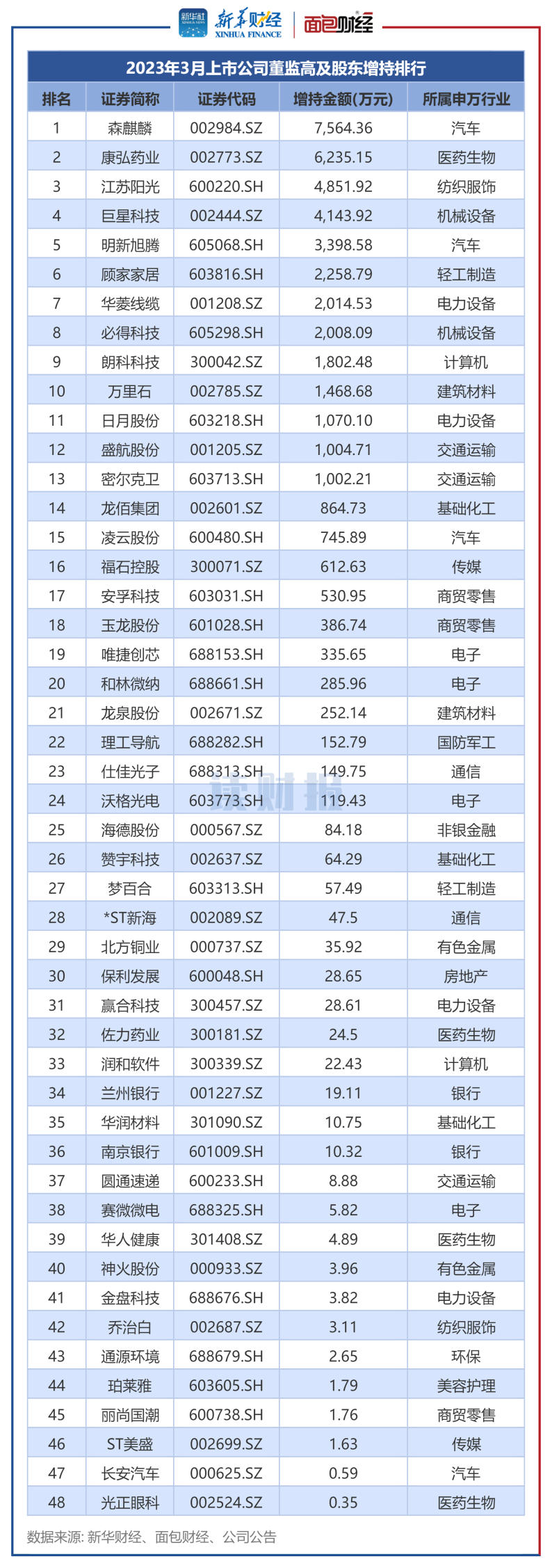 2023年3月,沪深两市上市公司董监高及其关联人增持金额合计约4.37亿元,涉及48家公司。