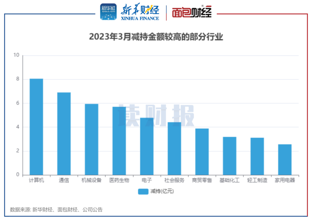 在申万行业分类下,计算机行业的减持金额排在首位,约为8.05亿元;通信行业的减持金额排在第二,约为6.90亿元;机械设备行业的减持金额也排名靠前,约为5.94亿元。