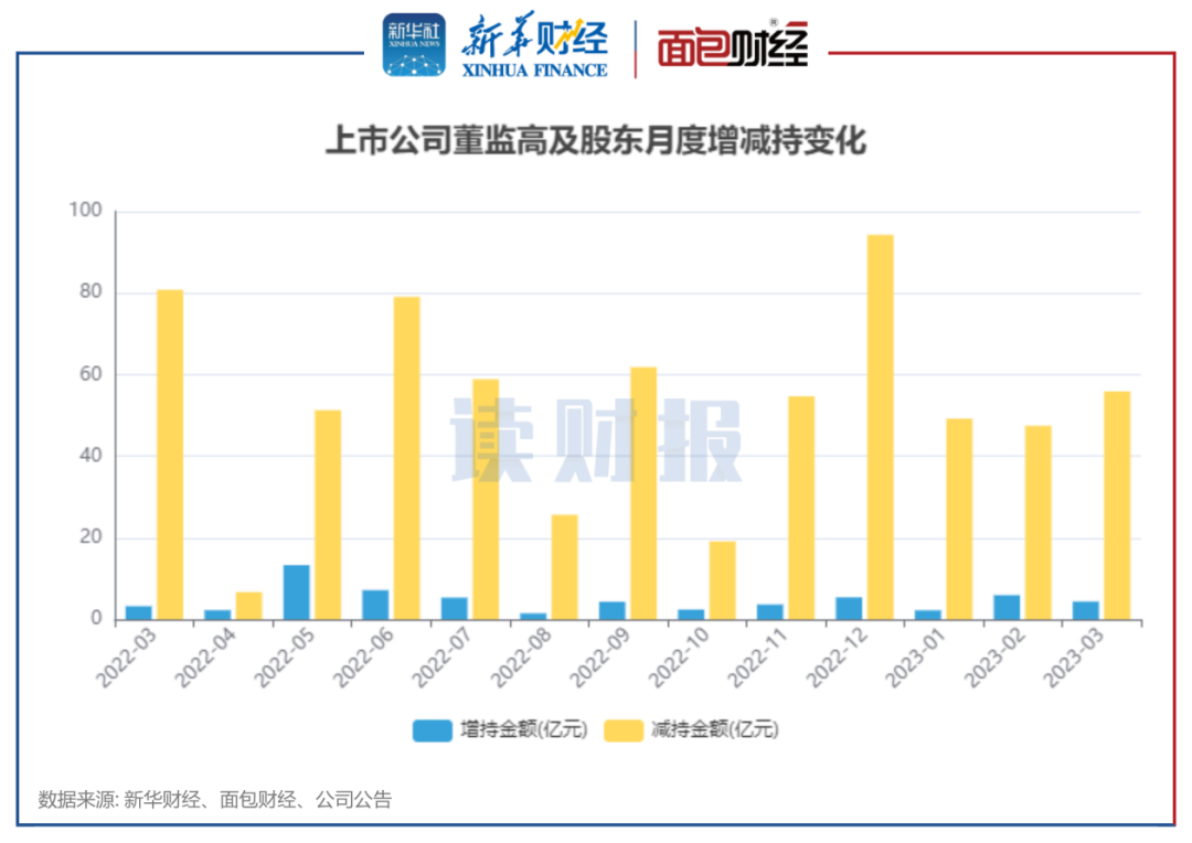 新华财经和面包财经研究员根据上市公司的信披数据统计,2023年3月,沪深两市上市公司董监高及其关联人减持金额合计约56.39亿元,涉及225家公司;增持金额合计约4.37亿元,涉及48家公司。增、减持金额相抵之后,净减持金额52.02亿元。