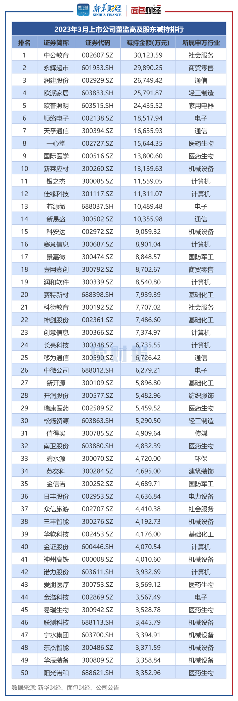 3月合计减持约56亿元 中公教育、永辉超市、润建股份减持金额居前