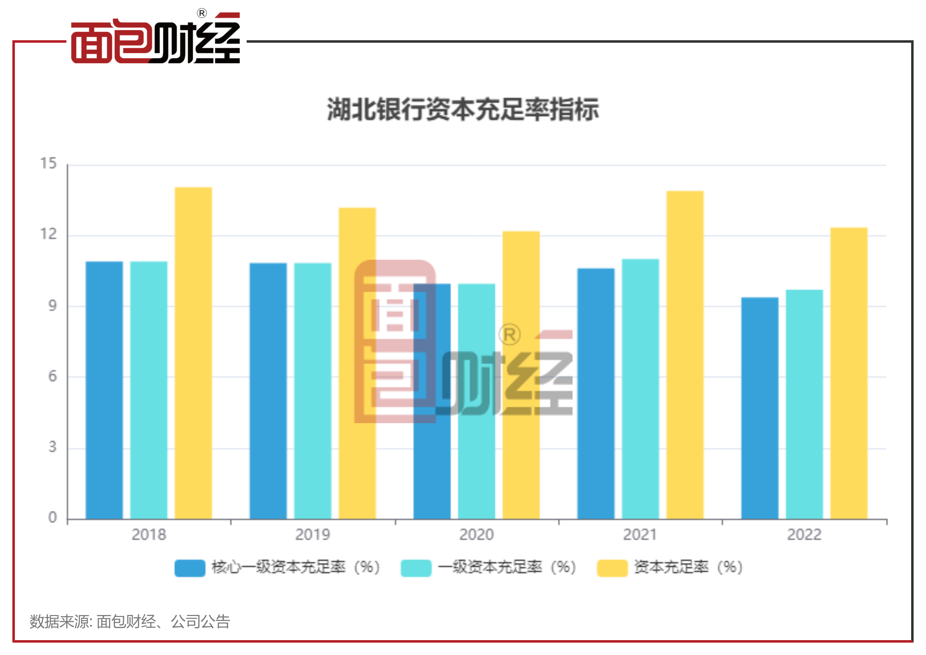 另外,历史数据显示,2018年至2020年湖北银行的资本充足率指标呈现下降趋势。2021年,或受增资扩股影响,该行资本充足率相关指标均上升,但2022年再次出现回落。