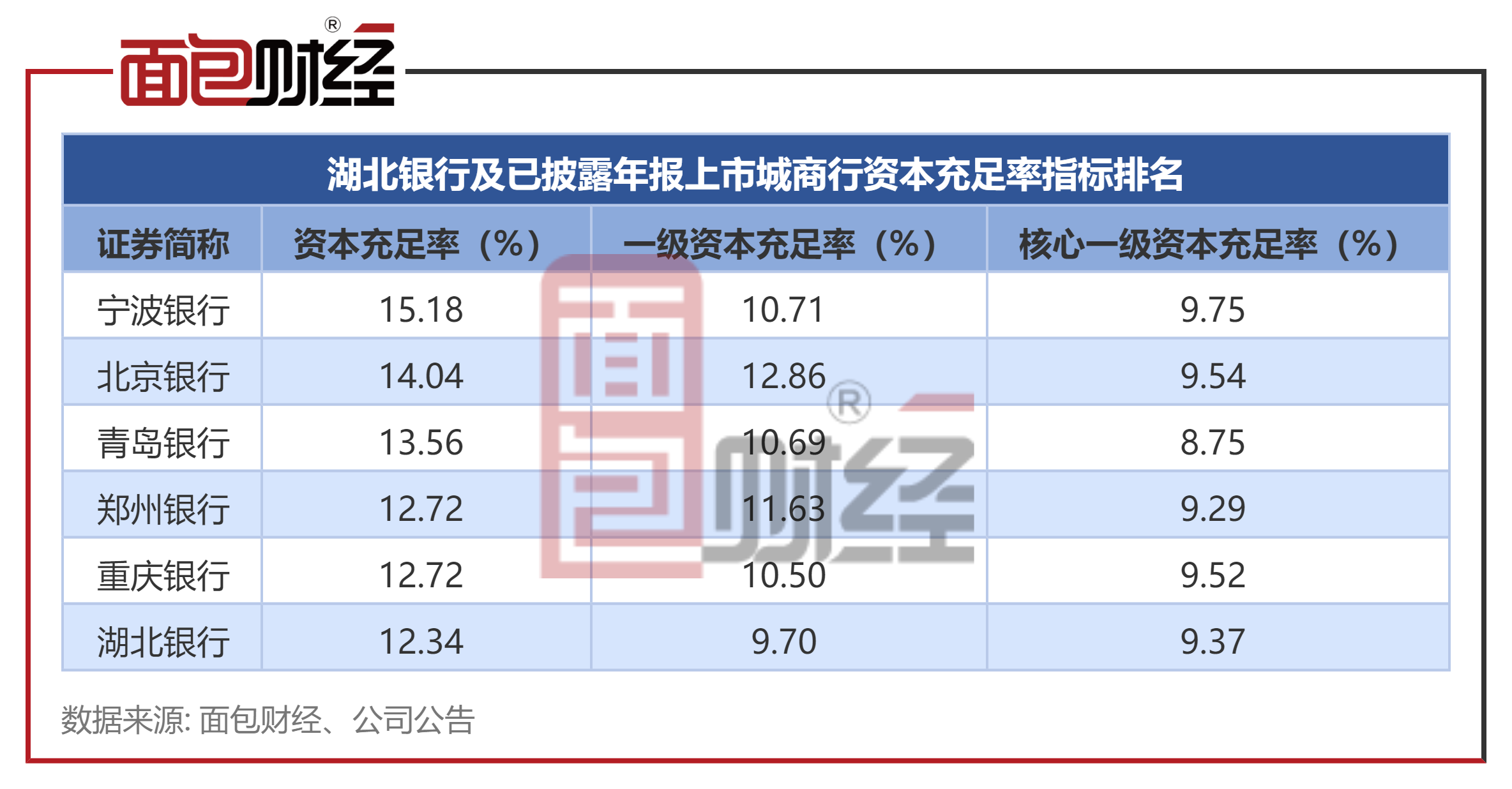 与已披露年报的上市城商行相比,截至2022年末,湖北银行的资本充足率相关指标仍较低,其中,资本充足率及一级资本充足率均排名末位。