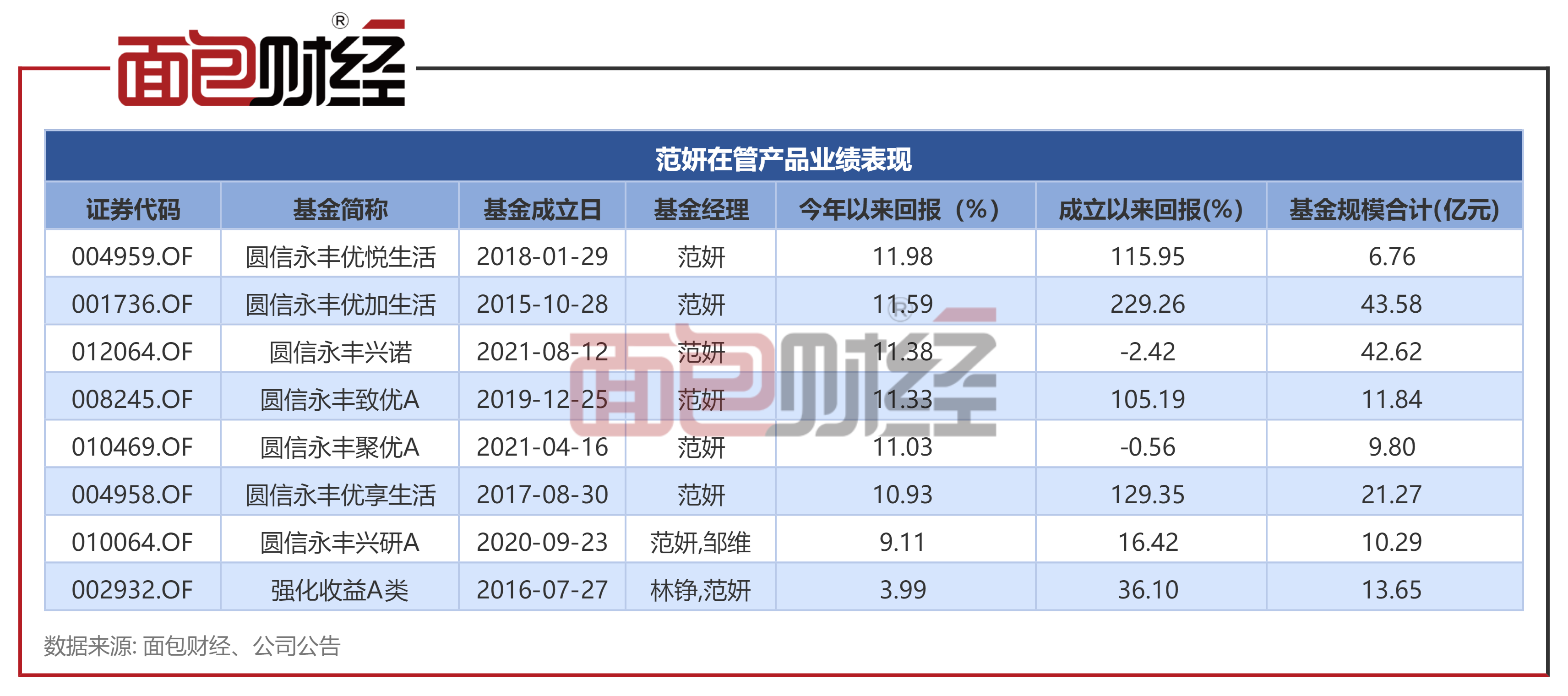 截至目前,范妍主要管理圆信永丰优加生活、圆信永丰兴诺、圆信永丰优享生活等8只产品(包括共同管理产品),合计管理规模超过150亿元。