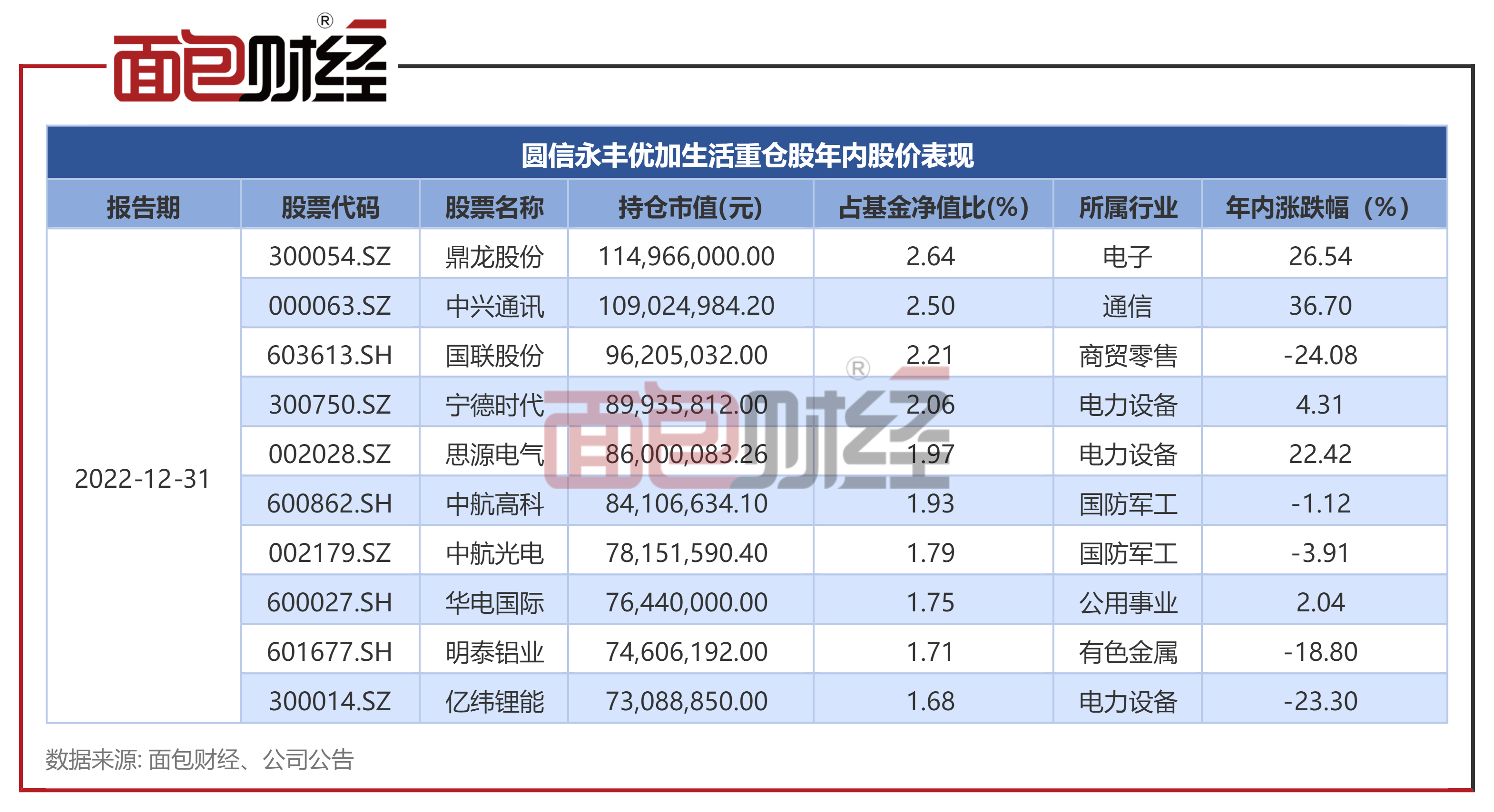 圆信永丰优加生活的持仓较为分散,2022年末,该基金前十大重仓股占基金资产净值的比例为20.25%。