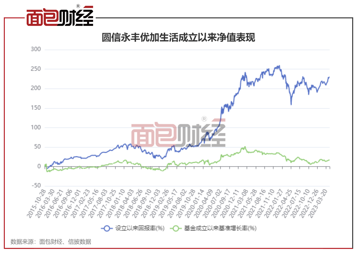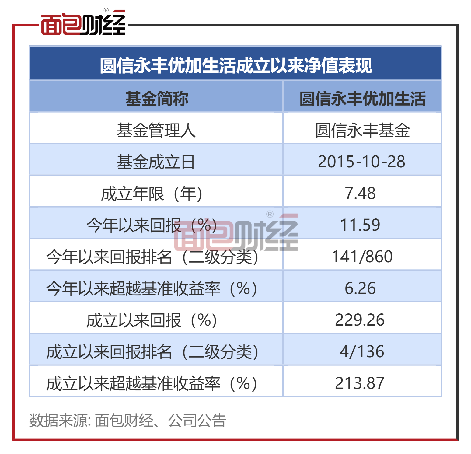 成立7年多以来,圆信永丰优加生活累计取得收益率229.26%,跑赢业绩比较基准超过200个百分点,同类排名4/136。