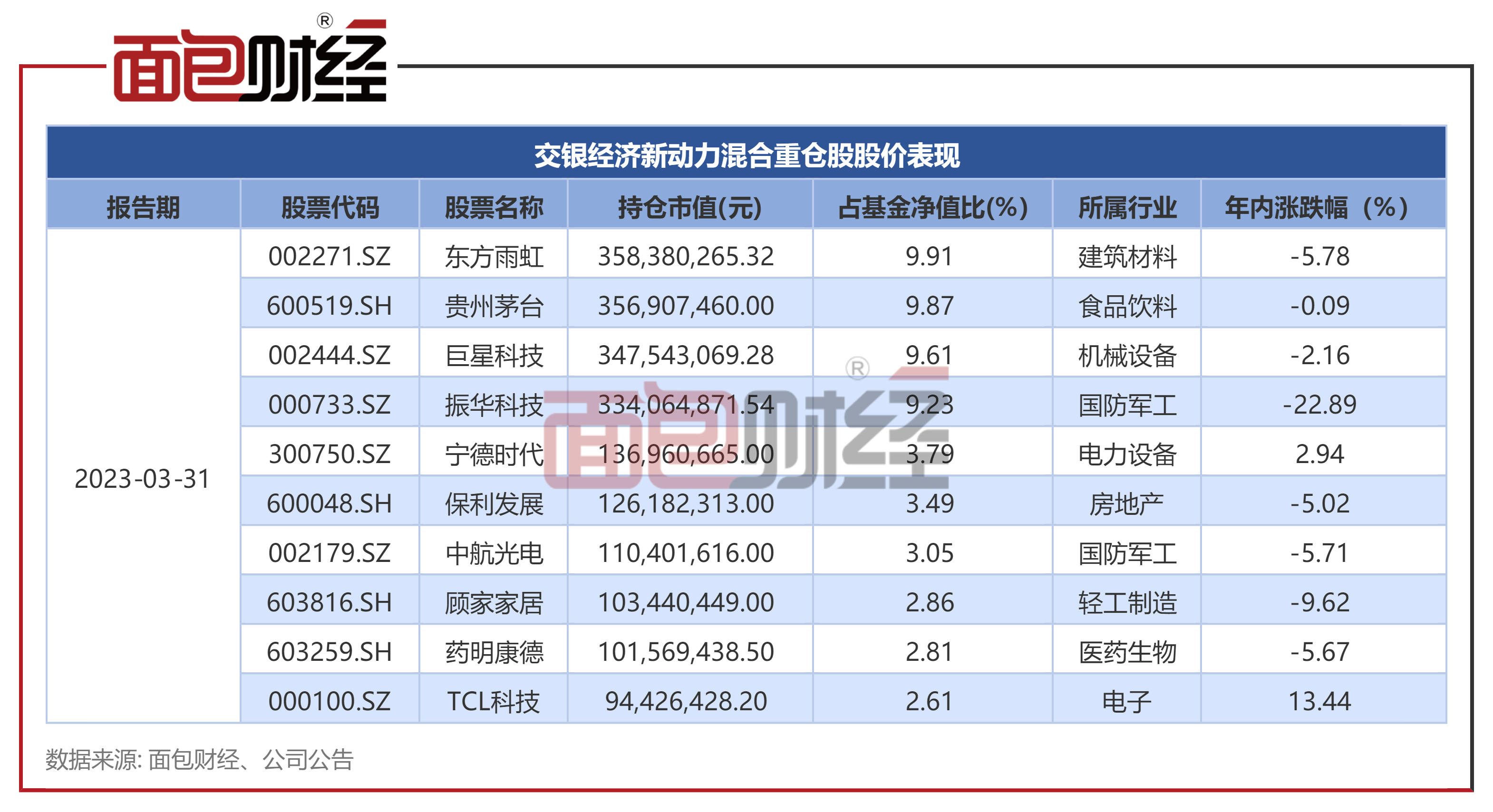数据显示,2023年一季度末,交银经济新动力混合股票持仓占基金总资产的比例为79.52%,相较2022年四季度末的65.2%加仓较为明显。