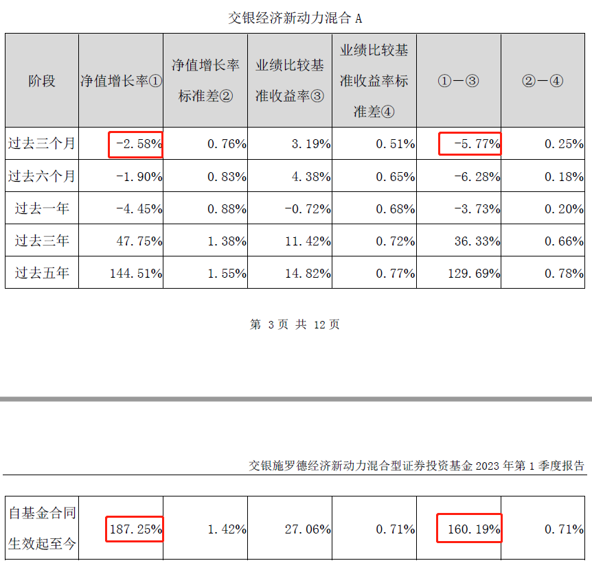 2023年一季度,交银经济新动力混合A净值下跌2.58%,跑输业绩比较基准5.77个百分点;成立以来至2023年一季度末,该基金累计收益率为187.25%,跑赢业绩比较基准160.19个百分点。
