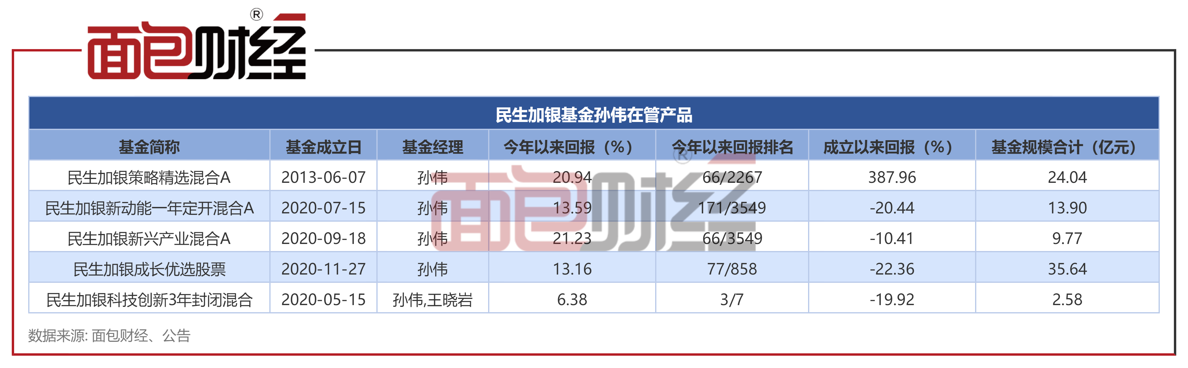 目前,孙伟主要管理民生加银成长优选股票、民生加银策略精选混合、民生加银新动能一年定开混合等5只产品(包括共同管理产品,初始基金口经),上述产品合计规模约85.94亿元。5只基金年初至今均实现正收益,其中有4只基金净值上涨超过13%。