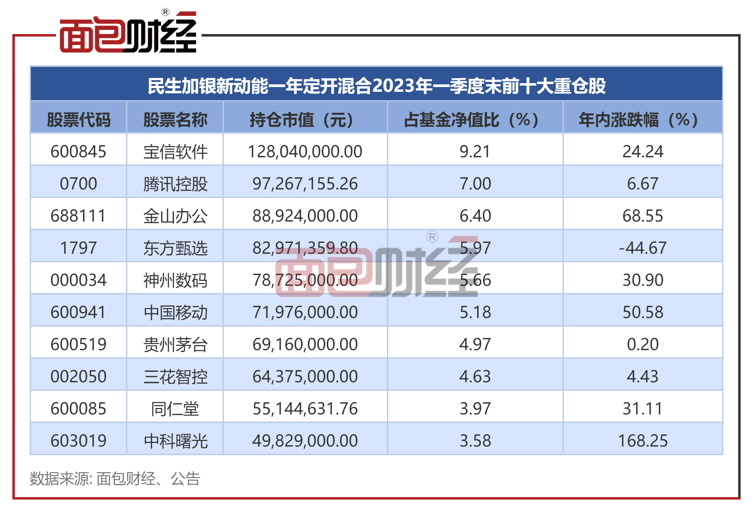 2023年一季度末,民生加银新动能一年定开混合的股票持仓占基金总资产的比例为82.98%,其中前十大重仓股占基金资产净值的比例为56.56%,持仓较为集中。