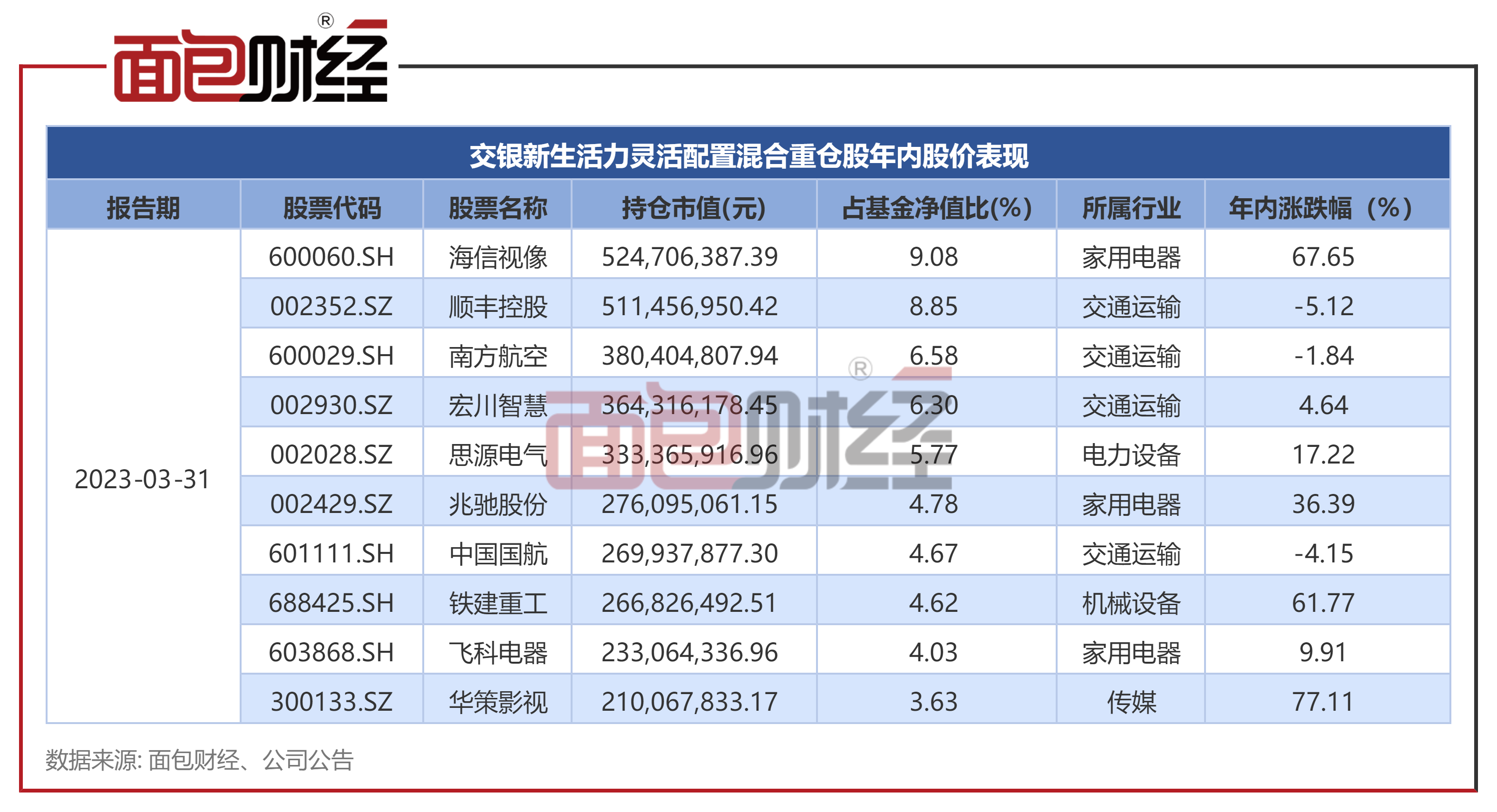 交银新生活力灵活配置混合前十大重仓股占基金资产净值的比例为58.3%,持仓较为集中。其中,海信视像、顺丰控股、南方航空是该基金的前三大重仓股。