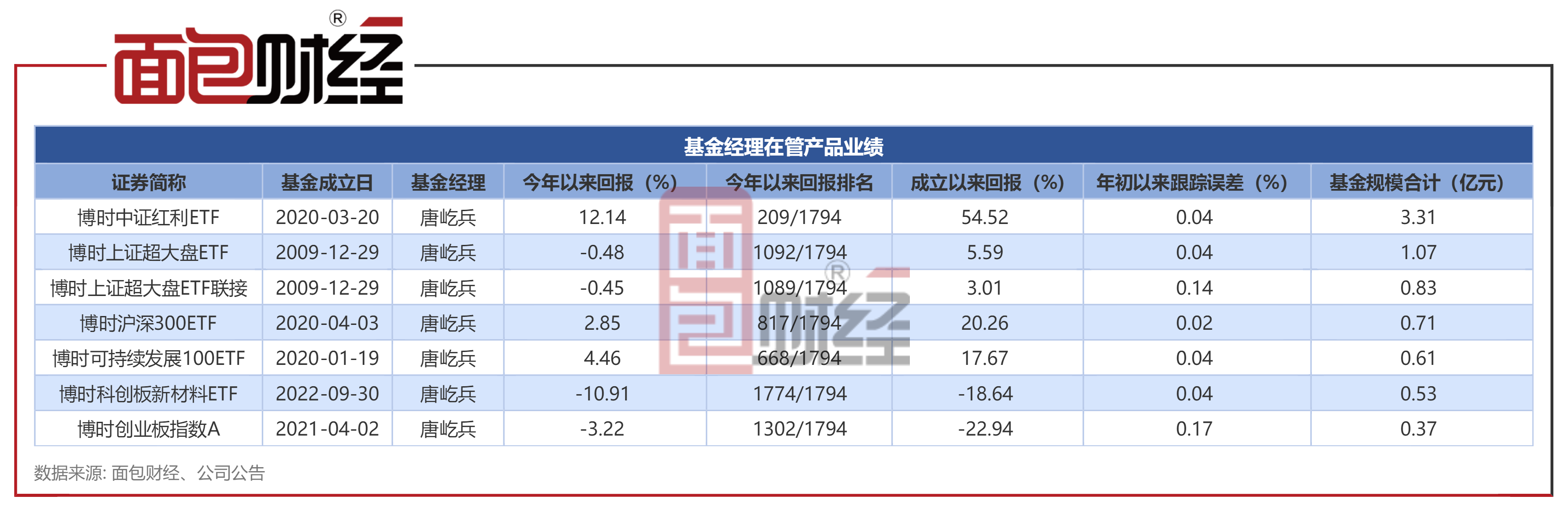 目前,唐屹主要管理博时中证红利ETF、博时上证超大盘ETF、博时上证超大盘ETF联接等7只产品(包括共同管理产品),上述产品均为被动指数型基金,合计规模约为7.43亿元。