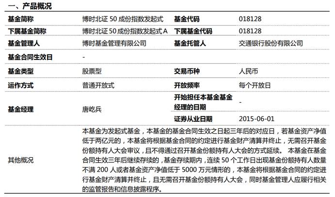 该基金为发起式被动指数基金,标的指数为北证 50 成份指数。该产品发起资金提供方(基金管理人、基金管理人高级管理人员或基金经理)认购此基金的金额不少于1000万元,持有份额集中度不得达到或者超过50%。